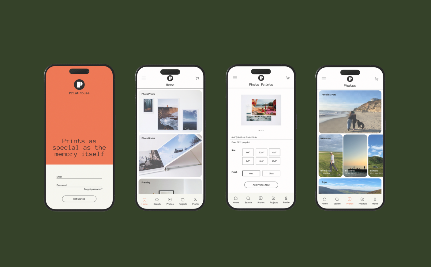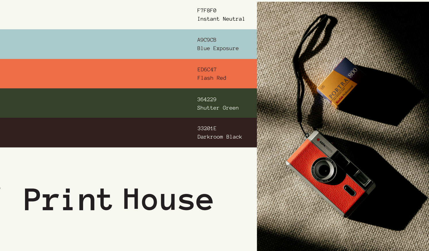 Rebranding for Snappy Snaps. Inspired by the naming of the original polaroid, the Land Camera, Print House gives memories a place to land, providing the means for those most special moments to live beyond the screen.